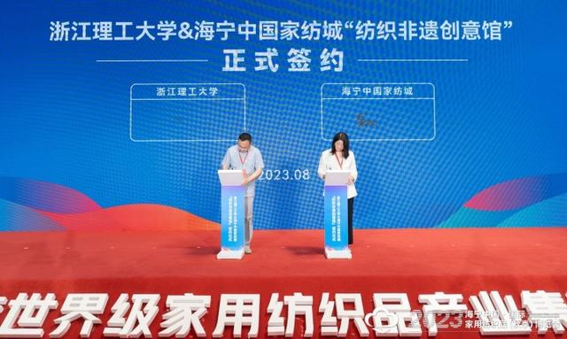 31万平方米的展区、2000余家企业参展、琳琅满目的家纺精品……8月13日,2023海宁中国·国际家用纺织品(秋季)博览会在海宁市许村镇开幕。开幕式上,浙江理工大学与海宁中国家纺城签约共建“纺织非遗创意馆”项目。